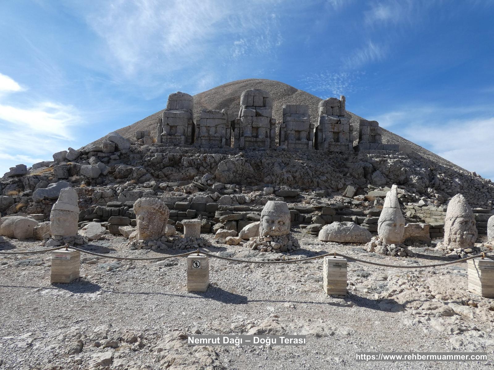 Yaklaşık 500 m²lik bir alana sahip olan Doğu Terasında kireç taşları ile sağlam bir platform yapılmış. Bu platform üzerine 7 metre yüksekliğinde kireç taşından 5 tane taht yerleştirilmiş.
