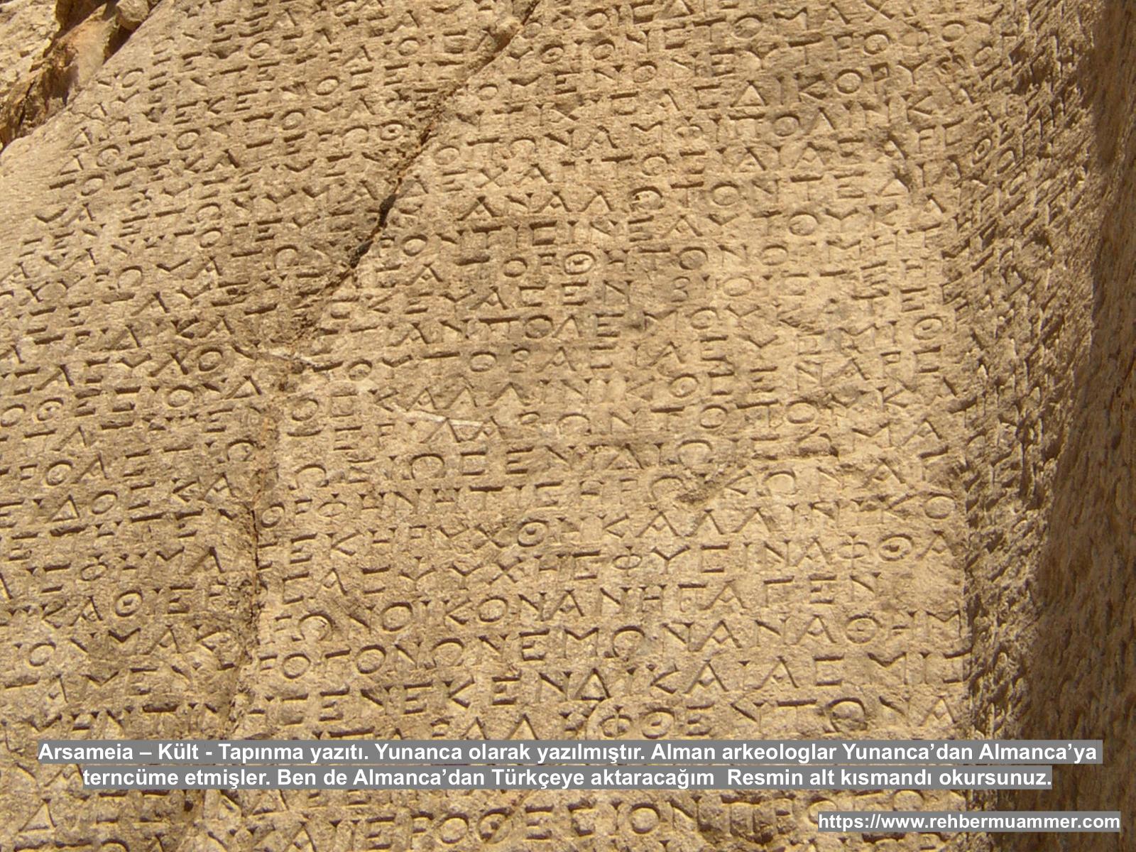 1. Antiochos ve Herakles tokalaşma sahnesinin altında yunanca harflerle yazılmış beş sütun olarak yazılmış kült yazıtını görürüz.