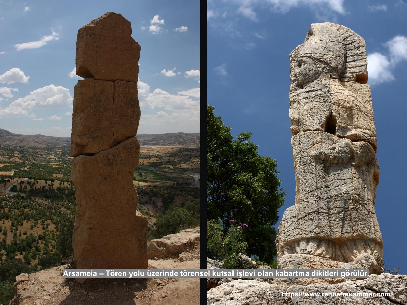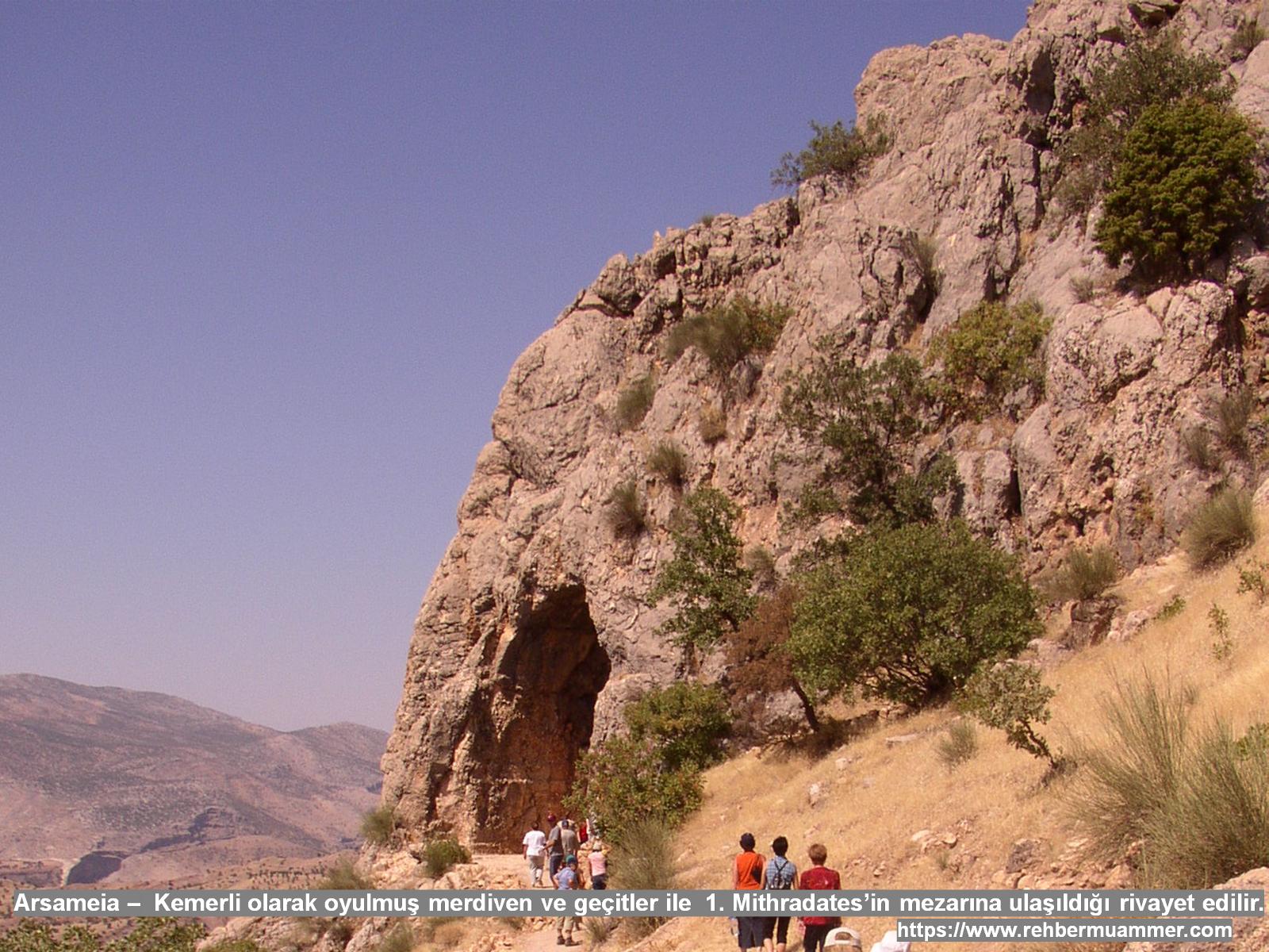 Kommagene kralı 1. Antiochos’un ( M.ö. 62-32 ) atalarından Arsames tarafından M.Ö. 1. yüzyılda kurulan Arsameia Antik Kenti kutsa alanı ( Hierothesion ) ve krallığın yazlık yönetim merkezidir. Burada ışık tanrısı Apollon – Mithras kabartması ve Kral Antiochos ile Herakles tokalaşma kabartması yer alır. Biri içecek ve gıdaları depolandığı diğeri ise dipse/ işlevli olan basamaklı kaya dehlizi üzerinde Anadolu’nun en büyük dini ve sosyal içerikli Grekçe yazıtı bulunan iki mağara bulunmaktadır. I. Antiochos’un babası Mithridates’e ait mezar yeri olan en üst kısımda ayrıca saray kalıntısı bulunmaktadır.