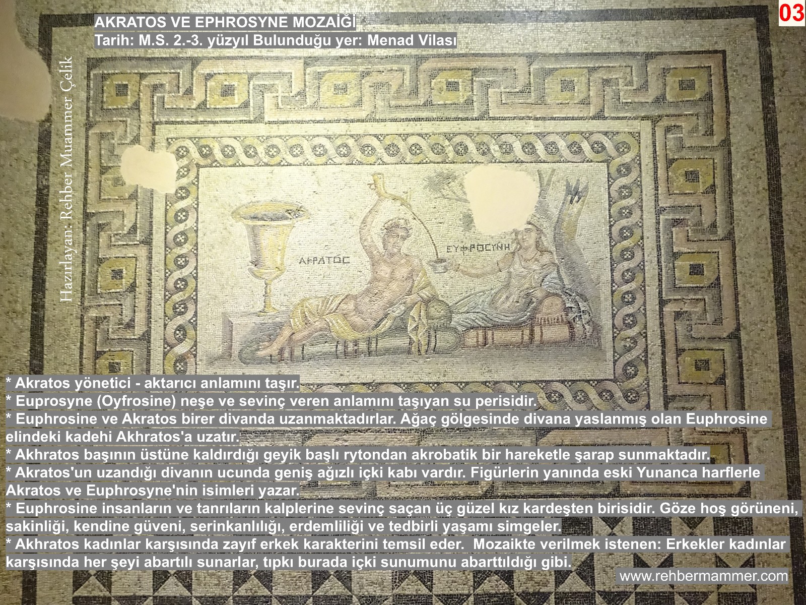 Müzede çoğunlukla roma dönemi 2. ve 3. yüzyıl eserleri sergilenir. Daha sonraki dönemlere ait az sayıda mozaikler de vardır.